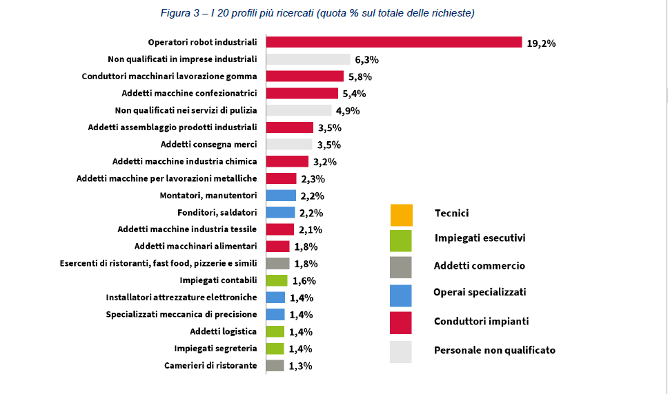 Nella classifica dei 20 profili maggiormente ricercati, i conduttori di impianti sono il gruppo più rappresentato nella graduatoria, con 8 profili su 20. il profilo maggiormente ricercato è quello degli operatori di catene di montaggio automatizzate e di robot industriali (19,2% sul totale). Seguono, rispettivamente al terzo e al quarto posto della graduatoria, i conduttori di macchinari per la lavorazione della gomma (5,8%) e gli addetti alle macchine confezionatrici (5,4%). Quindi, con richieste più basse, gli addetti all’assemblaggio dei prodotti industriali (3,5%), gli addetti alle macchine dell’industria chimica (3,2%), delle lavorazioni metalliche (2,3%), dell’industria tessile (2,1%) e dell’industria alimentare (1,8%).
