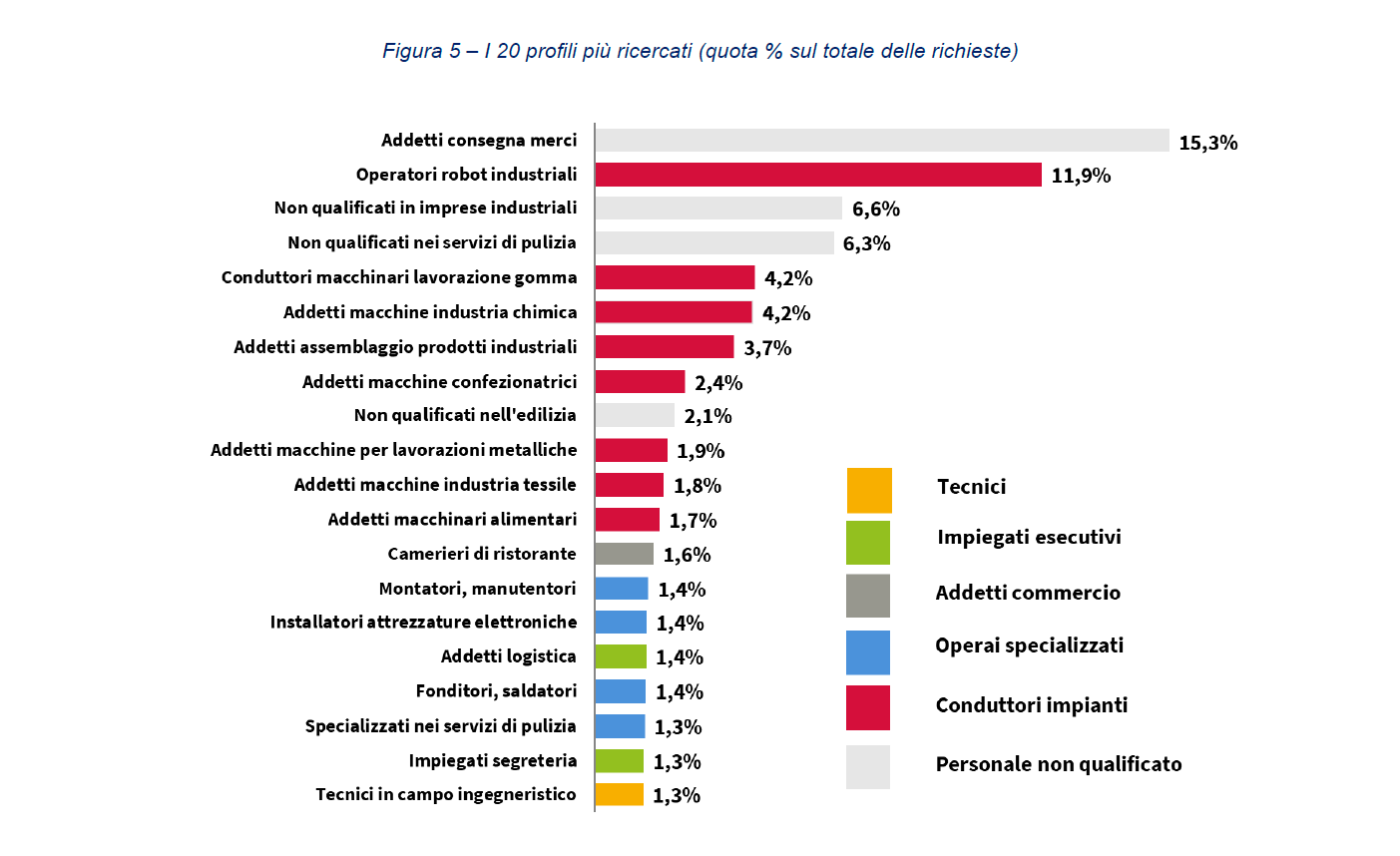 In particolare, nella lista dei primi 20 profili spiccano numerose figure professionali strettamente legate al processo produttivo manifatturiero: operatori di robot industriali (11,9%), conduttori di macchine per lavorazione della gomma (4,2%), addetti macchine per l’industria chimica (4,2%), addetti all’assemblaggio di prodotti industriali (3,7%), addetti alle macchine confezionatrici (2,4%), addetti alle macchine per lavorazioni metalliche (1,9%), alle macchine per l’industria tessile (1,8%) e ai macchinari alimentari (1,7%)