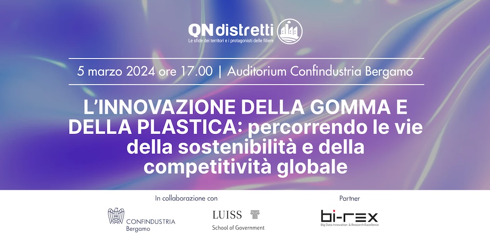 Nell’ambito del ciclo “Le sfide dei territori e dei distretti italiani: QN incontra i protagonisti delle filiere” - la rassegna di QN Distretti dedicata alle principali filiere di produzione italiane quali motore di crescita per i territori - martedì 5 marzo alle ore 17.00 in auditorium si terrà il primo appuntamento dal titolo “L’innovazione della gomma e della plastica: percorrendo le vie della sostenibilità e della competitività globale”, promosso da Confindustria Bergamo.