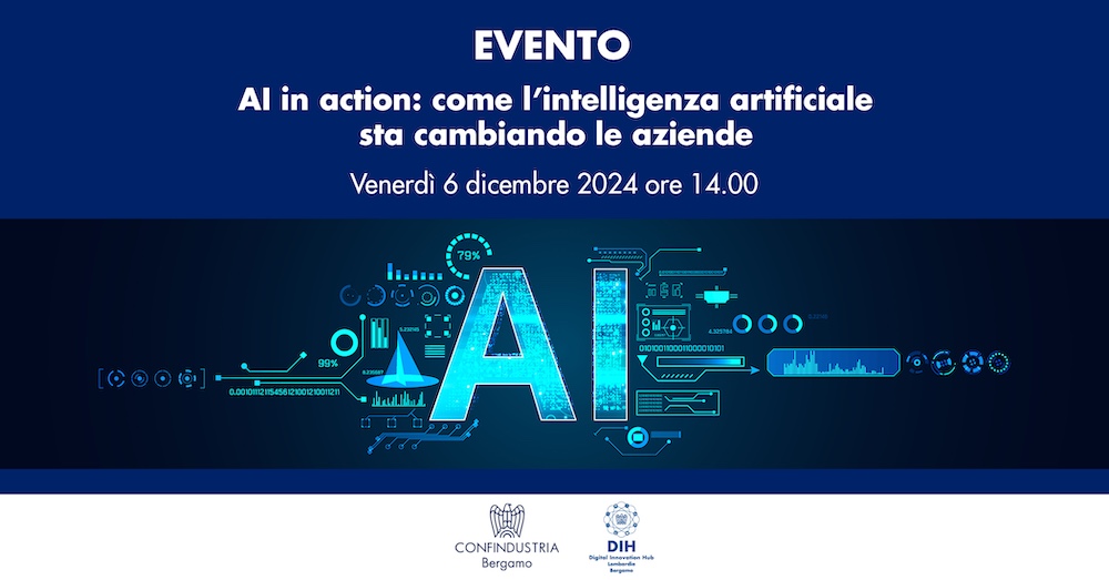 Confindustria Bergamo e Digital Innovation Hub Bergamo organizzano l’evento “AI IN ACTION: Come l'intelligenza artificiale sta cambiando le aziende”, che si terrà venerdì 6 dicembre 2024 dalle ore 14.00, in presenza presso l’Auditorium Confindustria Bergamo (Via Stezzano 87, 24126 Bergamo).