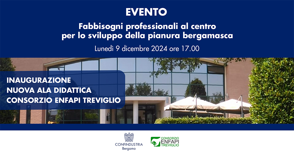 In occasione dell’inaugurazione della nuova ala didattica del Consorzio Enfapi, Confindustria Bergamo organizza un evento dal titolo "Fabbisogni professionali al centro per lo sviluppo della Pianura Bergamasca" che si terrà lunedì 9 dicembre alle ore 17.00 in via Pietro Nenni 4 a Treviglio.