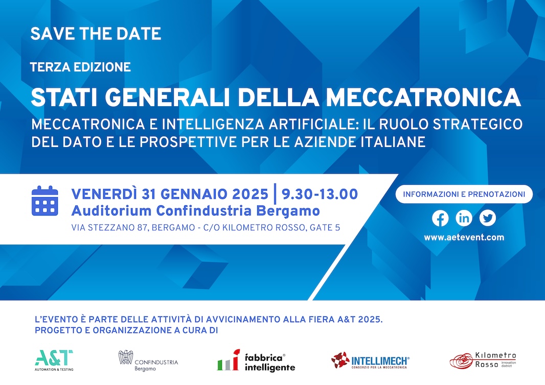 Venerdi 31 gennaio dalle ore 9.30 si terrà l'evento "STATI GENERALI DELLA MECCATRONICA", organizzato da A&T in collaborazione con Confindustria Bergamo, Consorzio Intellimech, Cluster Tecnologico Nazionale Fabbrica Intelligente e Kilometro Rosso.