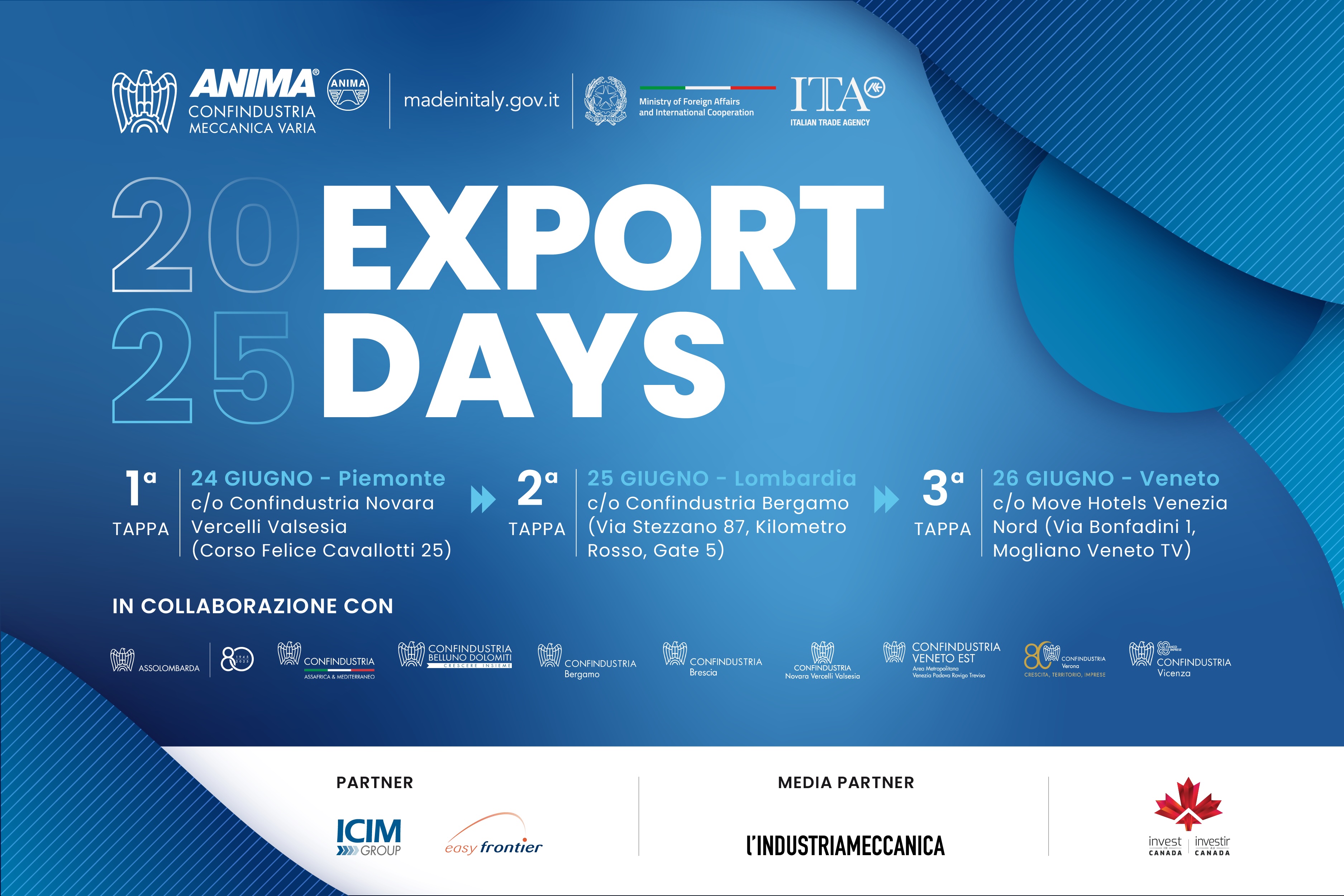 L'iniziativa è realizzata in collaborazione con alcune delle più importanti rappresentanze confindustriali del territorio. Oltre a Confindustria Bergamo, partecipano: Assolombarda, Confindustria Brescia, Confindustria Novara Vercelli Valsesia, Confindustria Belluno Dolomiti, Confindustria Veneto Est, Confindustria Verona, Confindustria Vicenza, Confindustria AssAfrica & Mediterraneo, con la partnership del Consolato Generale del Canada.