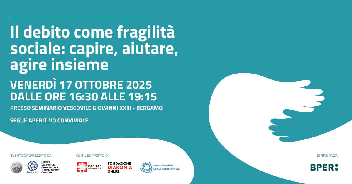 L’incontro, patrocinato da Confindustria Bergamo, sarà l’occasione per la presentazione ufficiale del progetto “Sportello di contrasto al sovraindebitamento”, nato dalla collaborazione tra Ordine dei Dottori Commercialisti e degli Esperti Contabili di Bergamo (ODCEC), Fondazione della Comunità Bergamasca e Fondazione Diakonia / Caritas Diocesana di Bergamo.