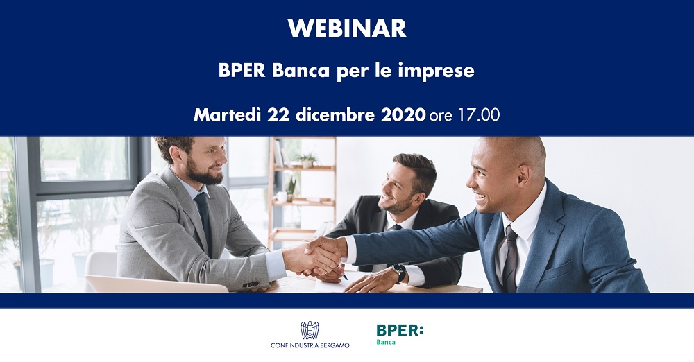 Per presentare e approfondire gli strumenti e i servizi a supporto delle imprese del nostro territorio, l'area Credito, Finanza e Confidi di Confindustria Bergamo, in collaborazione con BPER Banca, organizza martedì 22 dicembre dalle ore 17.00 un webinar dal titolo "BPER Banca per le imprese".