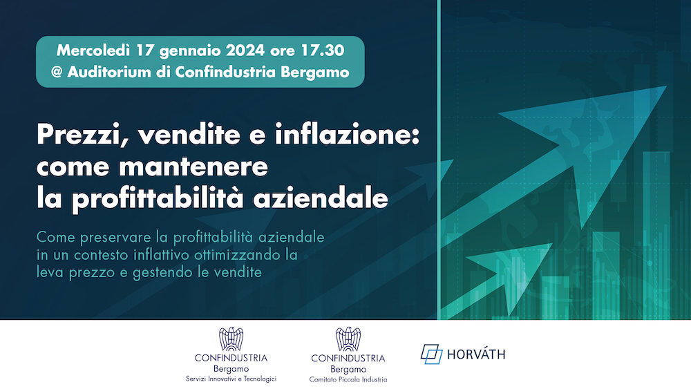 Per approfondire il tema, il Gruppo Servizi e Innovativi Tecnologici di Confindustria Bergamo e il Comitato Piccola industria di Confindustria Bergamo in collaborazione con Horváth Italia, organizzano un evento dal titolo "Prezzi, vendite e inflazione: come mantenere la profittabilità aziendale" che si terrà mercoledì 17 gennaio alle ore 17.30 presso l'auditorium di Confindustria Bergamo.
