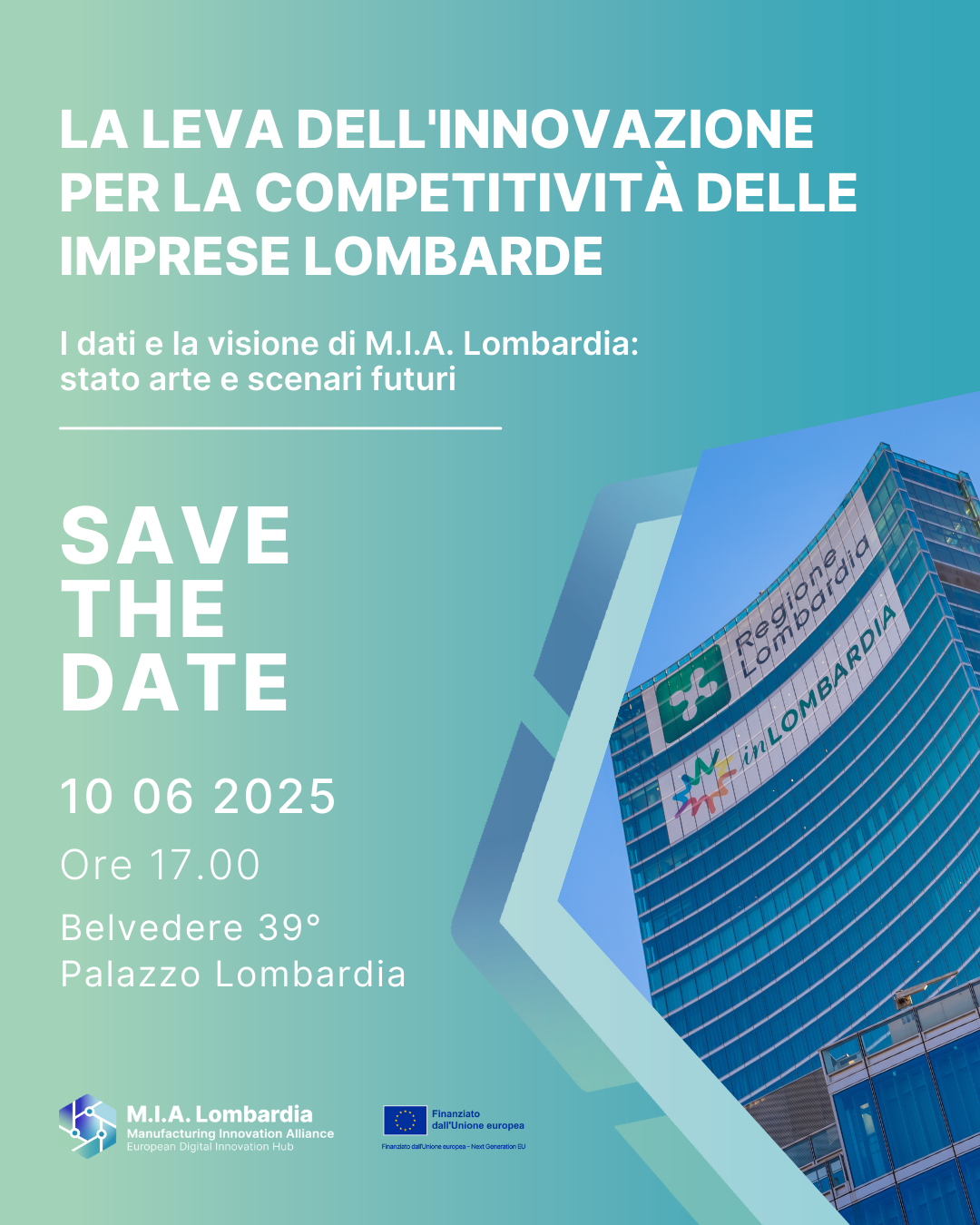 Il prossimo 10 giugno a partire dalle 17:00 si terrà l’evento istituzionale “La leva dell’innovazione per la competitività delle imprese lombarde. I dati e la visione di M.I.A. Lombardia: stato dell'arte e scenari futuri” presso il 39° piano di Palazzo di Regione Lombardia a Milano.