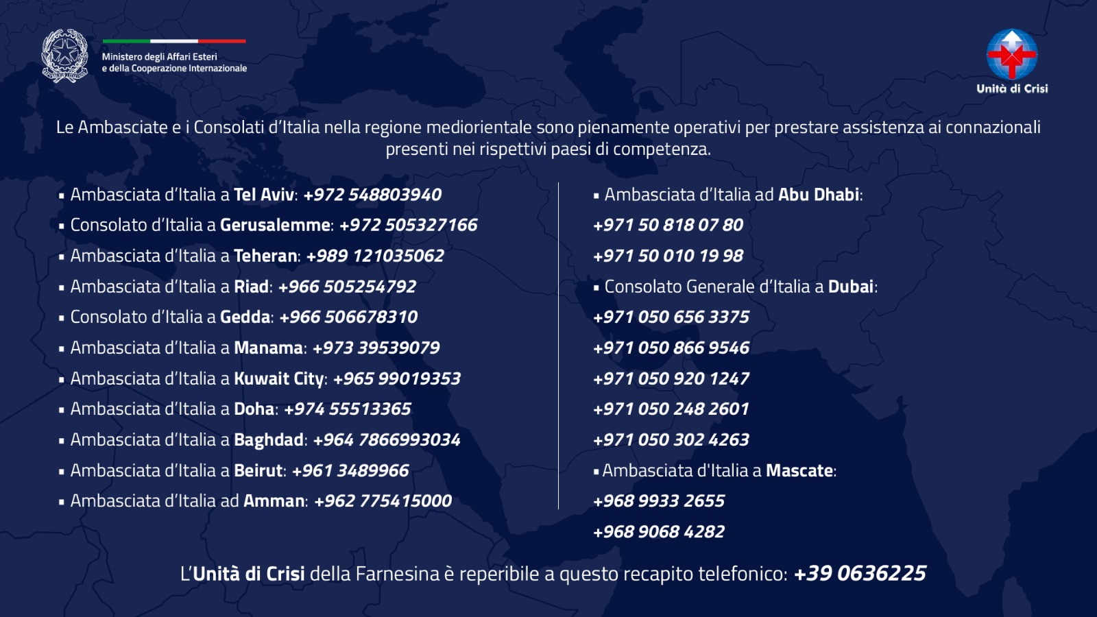 Per le richieste di assistenza ed emergenza nei Paesi interessati dalla crisi, di seguito e a questo link sono disponibili alcune indicazioni operative e i numeri di telefono per contattare Consolati e Ambasciate d’Italia e dell’Unità di Crisi della Farnesina.