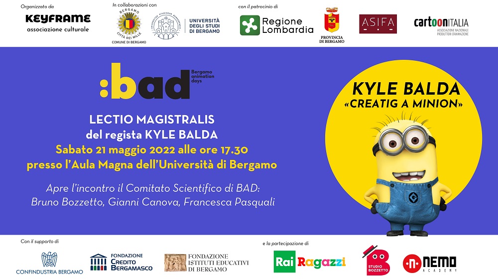 Sabato 21 maggio alle ore 17.30 Kyle Balda, regista e animatore di successi come Cattivissimo Me 3, Minions, Minions 2, Toy Story e Monsters&Co, terrà una lectio magistralis nell'Aula Magna dell'Università degli Studi di Bergamo.