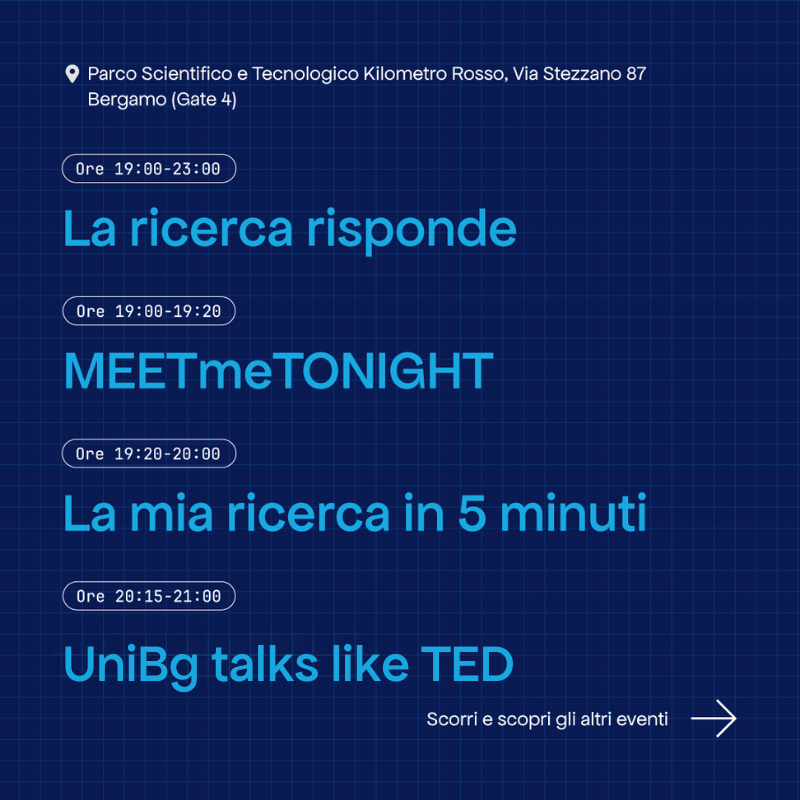 In occasione della Notte Europea dei Ricercatori 2024, che si terrà venerdì 27 settembre, BergamoScienza ha organizzato una serata speciale. Tre sedi, tre case dell’innovazione e della ricerca in collegamento fra loro e con il BiM Garden, progetto di rigenerazione urbana nel cuore di Bicocca a Milano, aprono le loro porte a studenti e appassionati per mostrare il proprio lavoro e omaggiare l’impegno della ricerca.