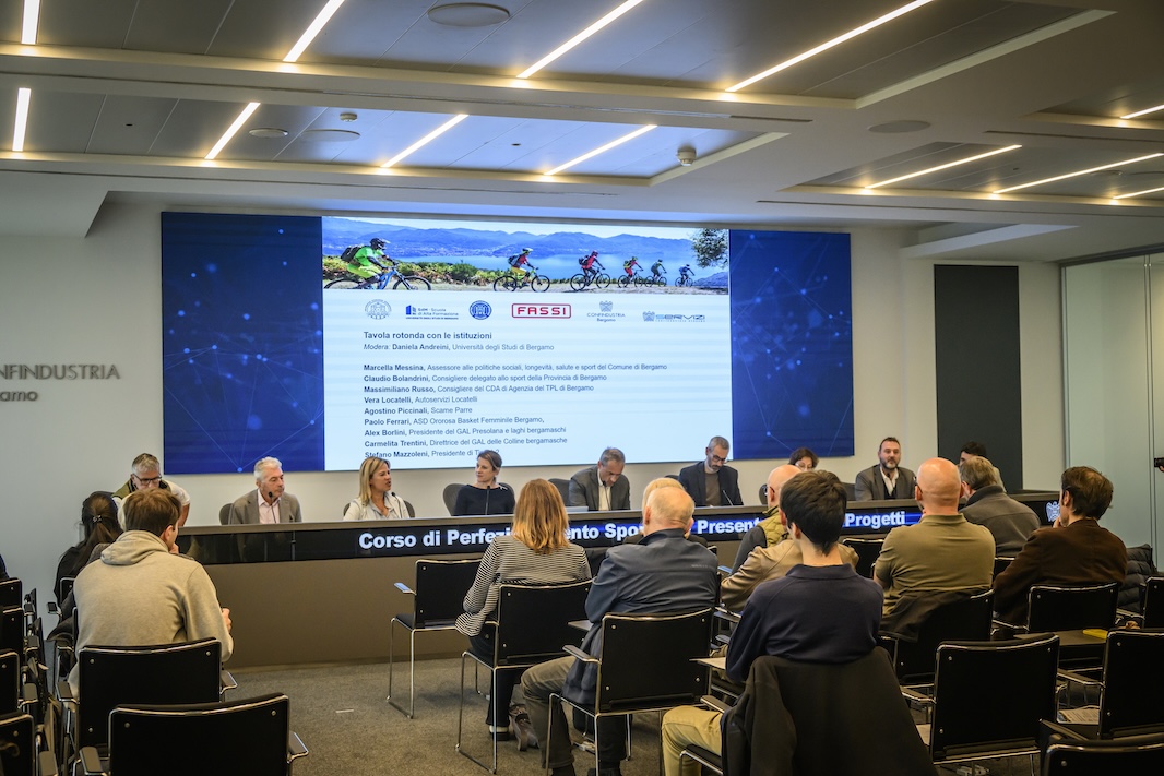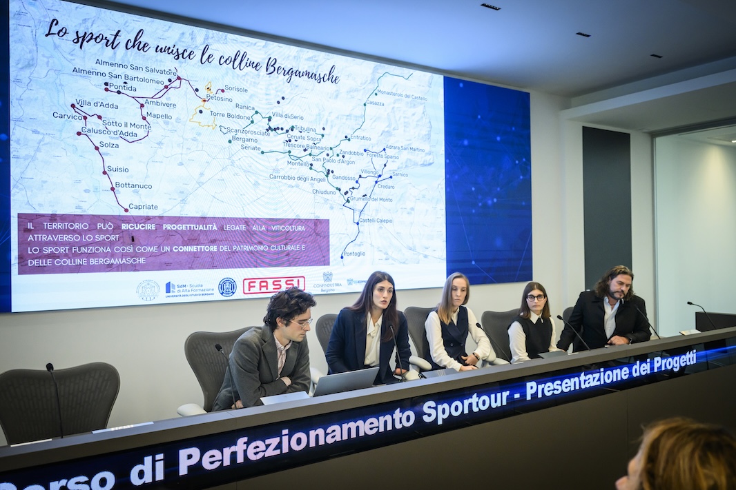 Sono stati presentati sabato 26 ottobre 2024 presso la sede di Confindustria Bergamo, i risultati della prima edizione del corso di perfezionamento SPORTOUR, incentrato sul management dello sport e della sua relazione con le imprese e il territorio per lo sviluppo di ecosistemi territoriali sostenibili, proposto da SdM – Scuola di Alta Formazione dell’Università degli Studi di Bergamo, su iniziativa di Giovanni Fassi, A.D. di Fassi Gru SpA, in collaborazione con Confindustria Bergamo, Servizi Confindustria Bergamo e il CUS - Centro Universitario Sportivo.