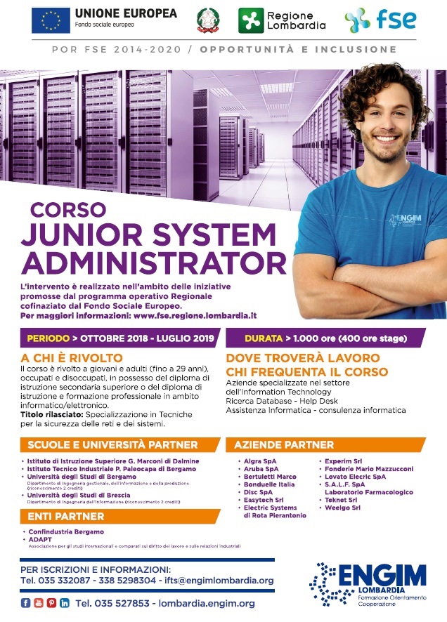Le aziende li cercano e spesso non li trovano: sono gli specialisti in sicurezza delle reti, tecnici che si occupano della gestione delle informazioni nell’ambito dei sistemi automatizzati, robotici e big data. Ora un corso IFTS formerà "Junior System Administrator", grazie a un percorso annuale in aula e in azienda. L‘iniziativa è promossa da ENGIM Lombardia e vede fra gli enti partner anche Confindustria Bergamo. Le lezioni, che si svolgeranno nella sede ENGIM di Brembate Sopra, prenderanno il via il 22 ottobre per concludersi a luglio. Affiancano ENGIM nel progetto anche numerose aziende del territorio, gli Istituti tecnici Marconi di Dalmine e Paleocapa di Bergamo, le Università di Bergamo e di Brescia e ADAPT, associazione per gli studi internazionali sul diritto del lavoro.