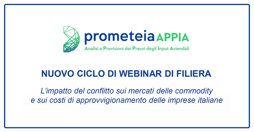 Per provare a rispondere a questi quesiti, partecipa al ciclo di webinar dal titolo “L’impatto del conflitto sui mercati delle commodity e sui costi di approvvigionamento delle imprese italiane“ che inizierà mercoledì 18 maggio 2022 alle ore 11.30, organizzato da Prometeia e alcune Associazioni Confindustriali dedicate alle diverse categorie merceologiche.