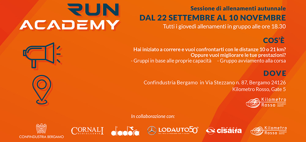 La prima sessione di allenamento si terrà giovedì 22 settembre alle ore 18.30. Il ritrovo è fissato presso la piazza antistante la sede di Confindustria Bergamo al gate 5 di Kilometro Rosso, in via Stezzano 87, Bergamo.
