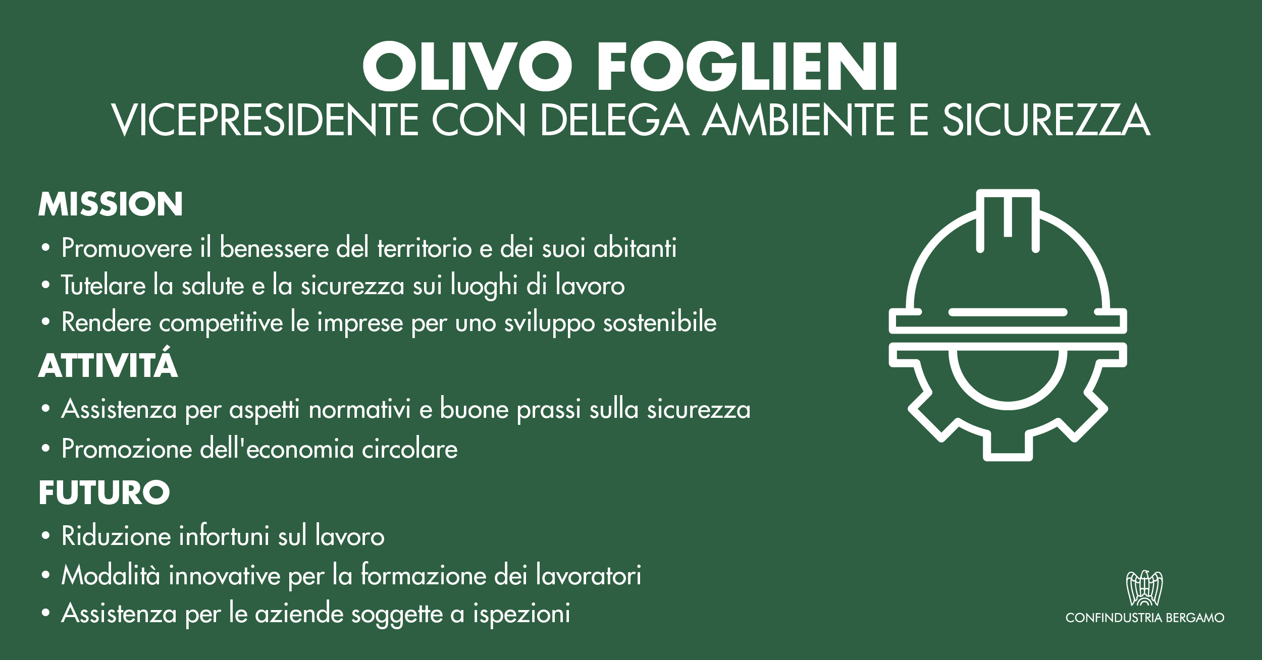 Per quanto riguarda la delega Ambiente e sicurezza, premesso che per Confindustria Bergamo la priorità è promuovere il benessere sia del territorio che dei suoi abitanti, nella convinzione che integrazione ottimale e coinvolgimento della forza lavoro siano ingredienti per la competitività delle imprese e per uno sviluppo sostenibile e duraturo, una prima linea d’azione riguarda la sicurezza sul lavoro. Le aziende vengono accompagnate sugli aspetti normativi e sull’applicazione delle buone prassi nella riduzione degli infortuni, inoltre Confindustria Bergamo promuove iniziative congiunte con enti e stakeholders del territorio per favorire la creazione di un contesto culturale e sociale condiviso.La seconda linea d’intervento si focalizza sul programma WHP di promozione della salute sui luoghi di lavoro, lanciato a ATS e sostenuto da Confindustria Bergamo, in particolare con i Giovani Imprenditori.