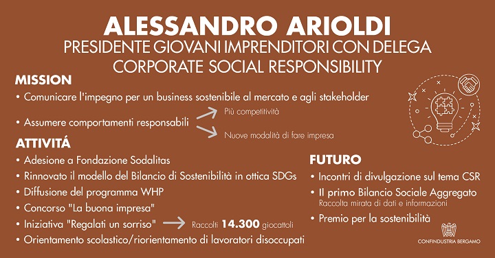 La Corporate Social Responsibility, delega attribuita al presidente dei Giovani Imprenditori, si basa sul presupposto che assumere comportamenti responsabili - verso la società, verso il territorio – permette di essere più competitivi e aiuta a immaginare nuove modalità di fare impresa. Occorre però rendicontare efficacemente l’impegno per la sostenibilità del business e comunicare questo impegno al mercato e agli stakeholders. Fra le iniziative in questo ambito c’è l’adesione a Sodalitas e l’organizzazione di incontri di divulgazione soprattutto a favore delle piccole e medie imprese. E’ stato inoltre rinnovato il modello del Bilancio di sostenibilità dell’Associazione, grazie al quale si intende rendicontare le attività nell’ottica del raggiungimento degli SDGs, gli obiettivi di sviluppo sostenibile delle Nazioni Unite, e porre le basi per la prima versione del bilancio sociale aggregato delle imprese associate, all'interno del quale venga valorizzato l’impegno verso la sostenibilità e misurato l’impatto sul territorio. Il Gruppo Giovani ha inoltre contribuito a diffondere il programma WHP, in collaborazione con ATS Bergamo, per migliorare la salute e il benessere sui luoghi di lavoro. Fra le iniziative di responsabilità sociale spiccano anche il concorso “la Buona Impresa”, nel quale vengono premiate le aziende che sviluppano progetti a favore delle categorie di lavoratori “svantaggiati”, la raccolta di giocattoli usati “Regalati un sorriso”, la collaborazione con l’Ufficio diocesano per la Pastorale del Lavoro per interventi di orientamento scolastico e/o riorientamento di lavoratori disoccupati. Per i prossimi mesi gli impegni riguardano la diffusione della conoscenza della CSR e della sua applicabilità in azienda e la promozione del bilancio sociale aggregato, che permetterà - anche alle aziende meno preparate - di disporre di un metodo codificato di rendicontazione, attraverso la raccolta mirata di dati e informazioni rilevanti. In abbinamento a questa attività è prevista la valorizzazione dell’impegno degli associati in chiave di sostenibilità, grazie anche all’organizzazione di un premio ispirato al Sodalitas Awards.
