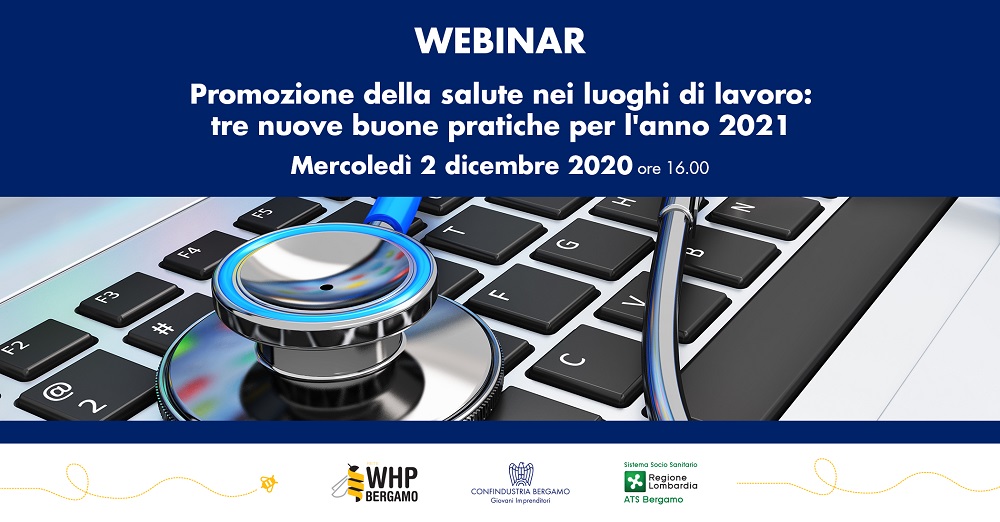 Mercoledì 2 dicembre alle ore 16.00 si terrà il webinar dal titolo "Promozione della salute nei luoghi di lavoro: tre nuove buone pratiche per l'anno 2021" rivolto alle aziende iscritte o interessate ad aderire al programma volontario WHP (Workplace Health Promotion), ideato da ATS Bergamo nel 2011 e che vede la collaborazione attiva di Confindustria Bergamo.