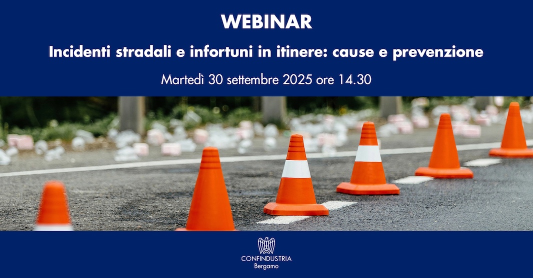 Il giorno 30 Settembre 2025 dalle 14:30 alle 16:45 Confindustria Bergamo organizza un webinar in collaborazione con l’ Associazione Italiana Familiari e Vittime della Strada, sezione di Bergamo dal titolo: “Incidenti stradali e infortuni in itinere, cause e prevenzione”.