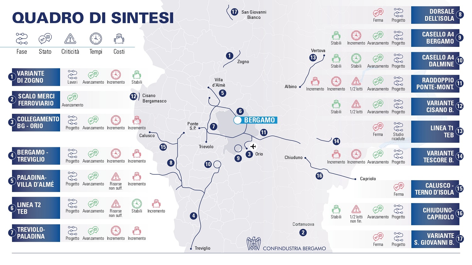 A livello progettuale, quasi la metà delle opere (8 su 17) si trova nella fase di studio di fattibilità tecnica ed economica. Soltanto due, la variante di Zogno e la Treviolo-Paladina, sono in fase realizzativa e dovrebbero vedere la conclusione dei lavori tra la metà e la fine del 2021. Per altre non mancano criticità: la Paladina-Villa d’Almé ha per esempio risorse azzerate, criticità a vari livelli vengono evidenziate anche per la variante di Cisano, il raddoppio delle Ponte-Montello e la Chiuduno-Capriolo.