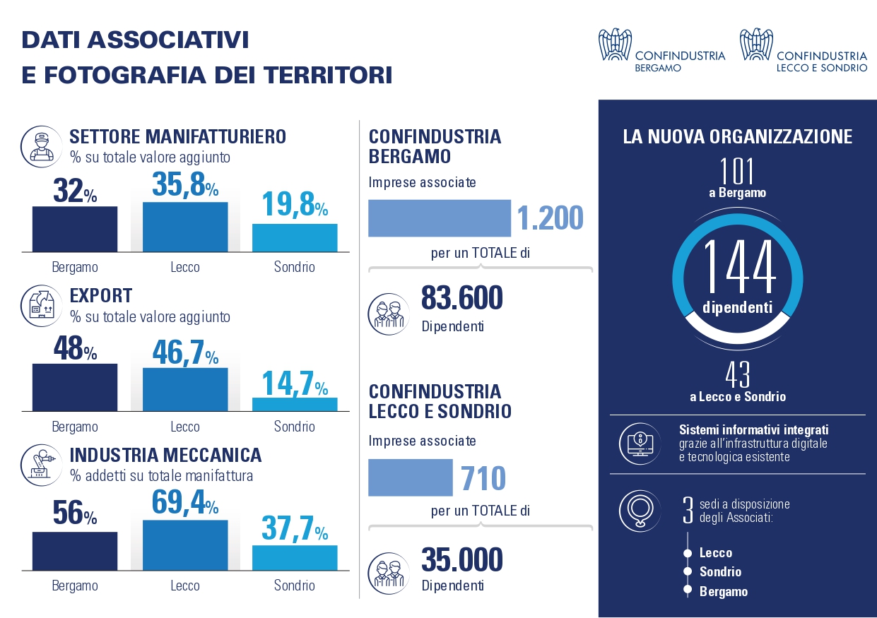 Le Assemblee hanno anche sancito il prolungamento del periodo di validità degli attuali Organi delle rispettive Associazioni, che porteranno a compimento il percorso di fusione guidate dai due Presidenti Stefano Scaglia, Presidente di Confindustria Bergamo, e Lorenzo Riva, Presidente di Confindustria Lecco e Sondrio.