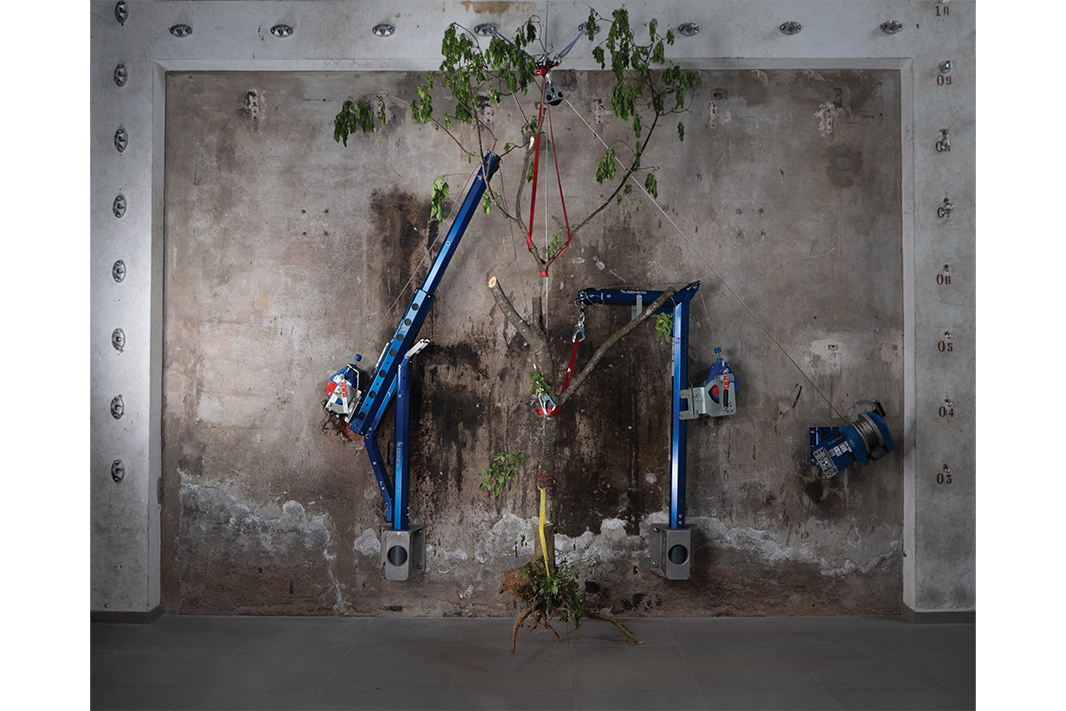 L’albero, simbolo naturale di stabilità, viene ricreato attraverso un equilibrio artificiale che ne restituisce l’unità. È un’immagine sospesa tra fragilità e forza, tra disgregazione e sostegno.
