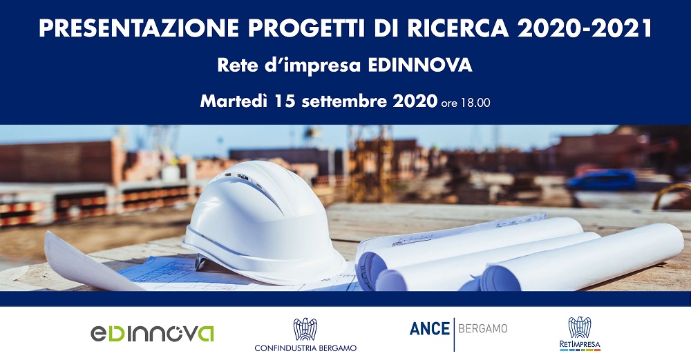 Martedì 15 settembre 2020 alle ore 18 non perdere l'appuntamento con EDINNOVA, la Rete per l’Innovazione della filiera dell’Edilizia nata lo scorso luglio, promossa da Confindustria Bergamo e Ance Bergamo e supportata da RetImpresa, l’Agenzia di Confindustria per le aggregazioni e reti d’impresa.